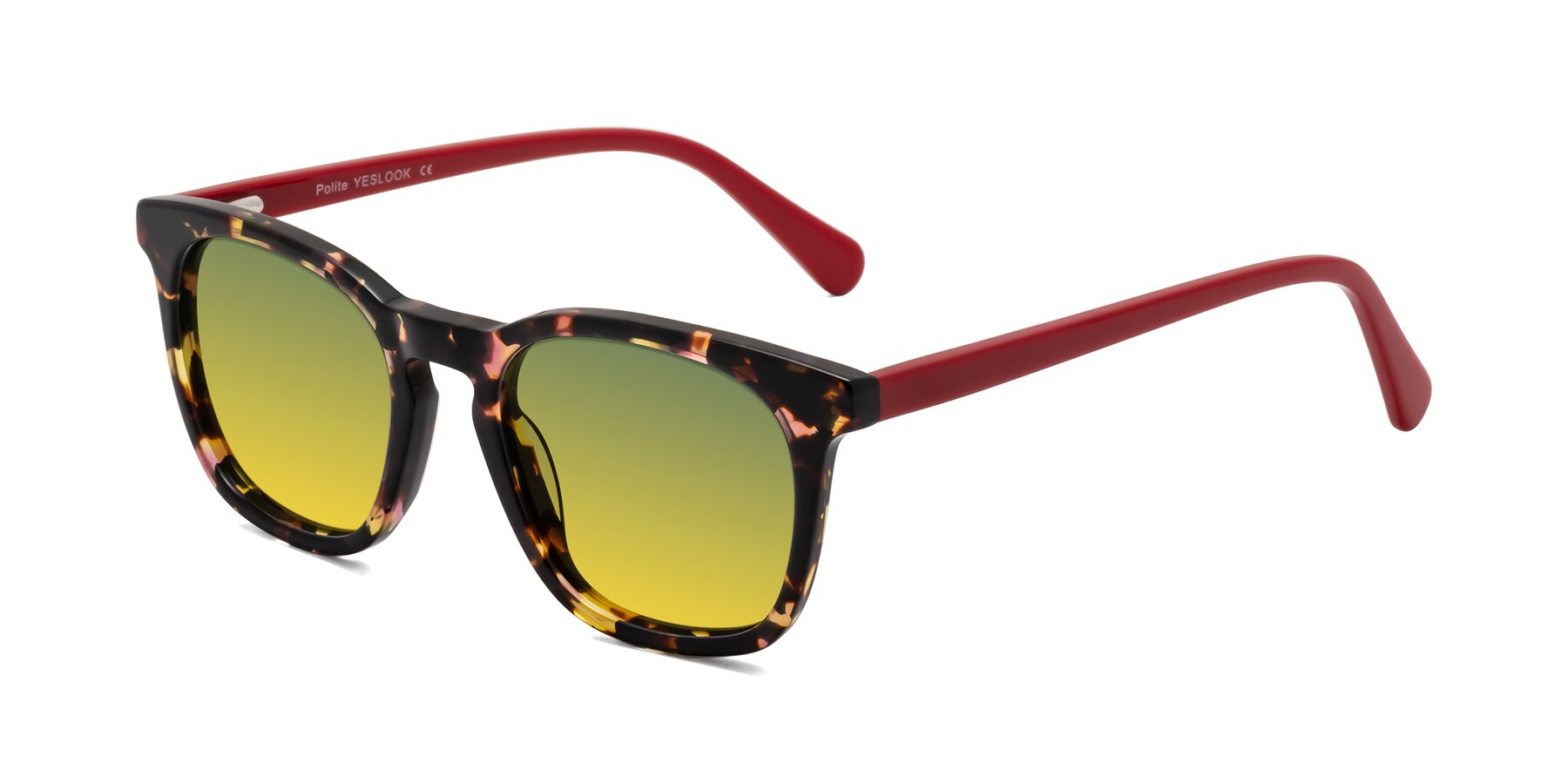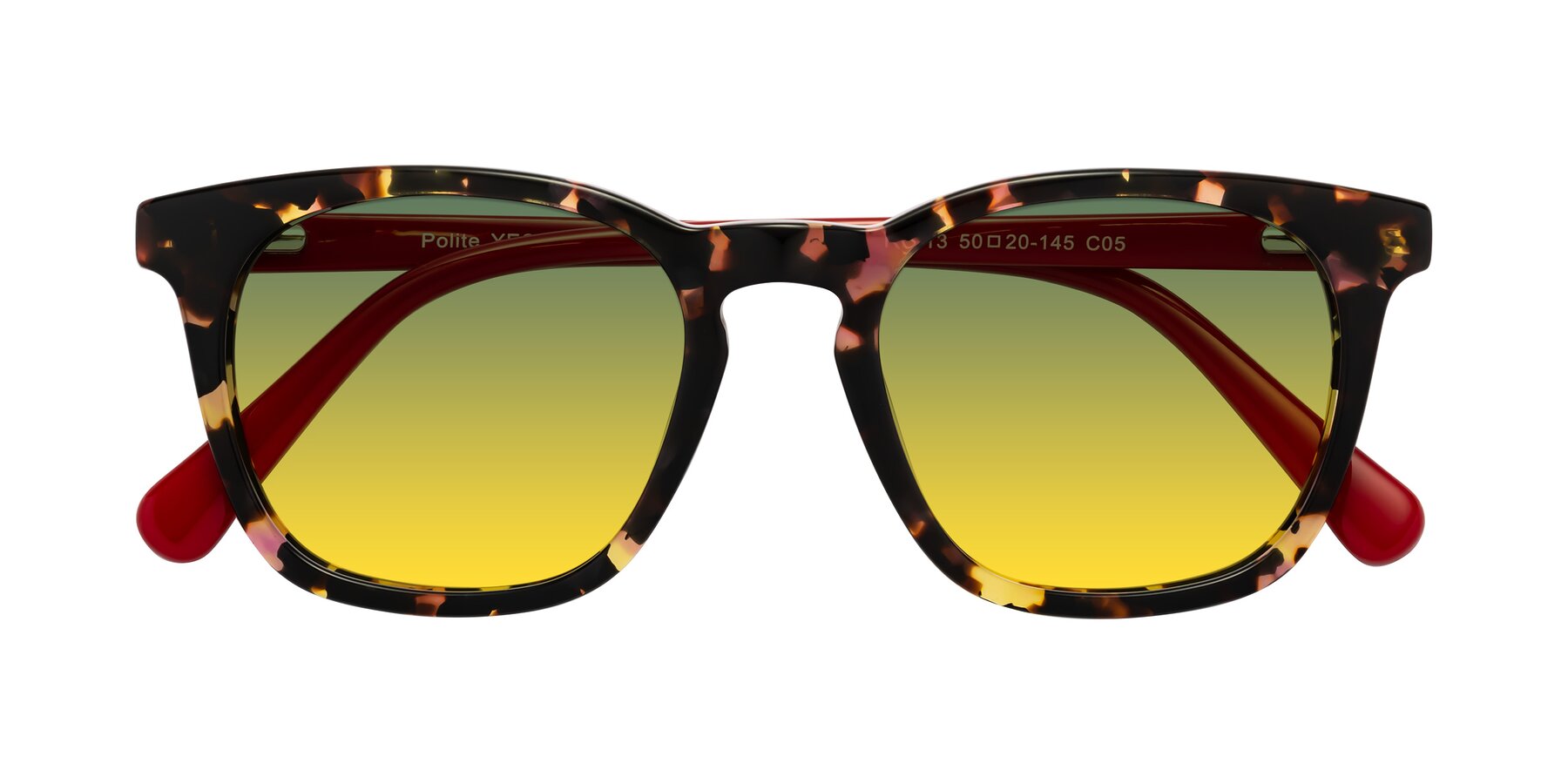 Tortoise/Red Keyhole Bridge Spring Hinges Trapezoid Gradient Sunglasses with Green / Yellow Sunwear Lenses
