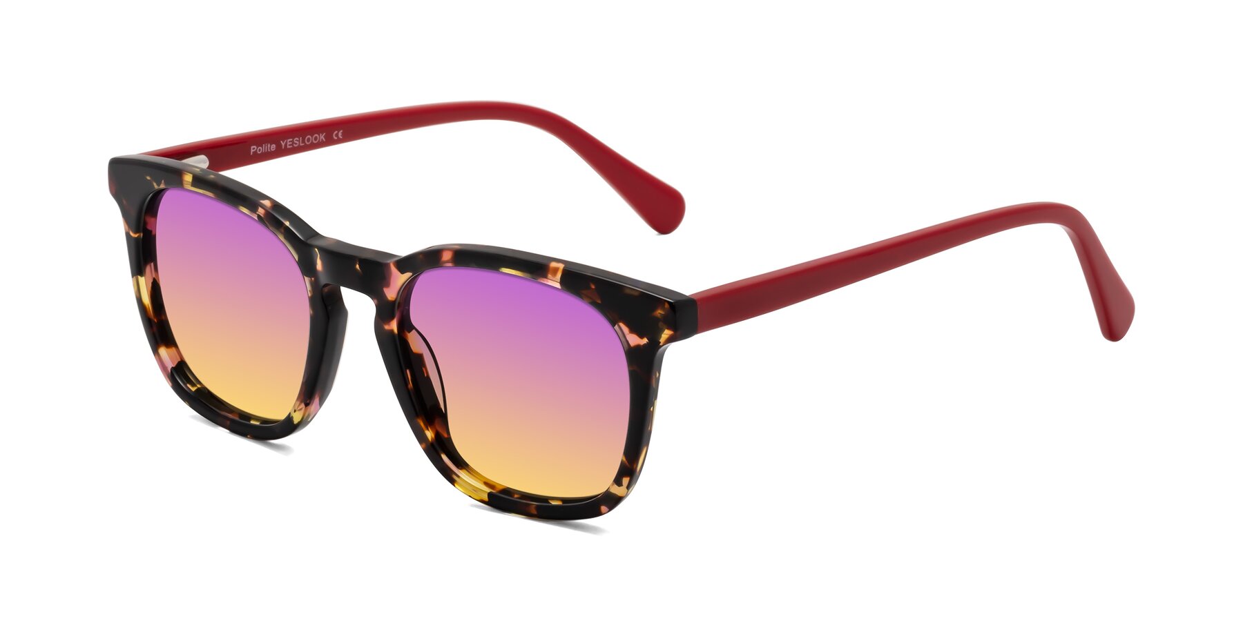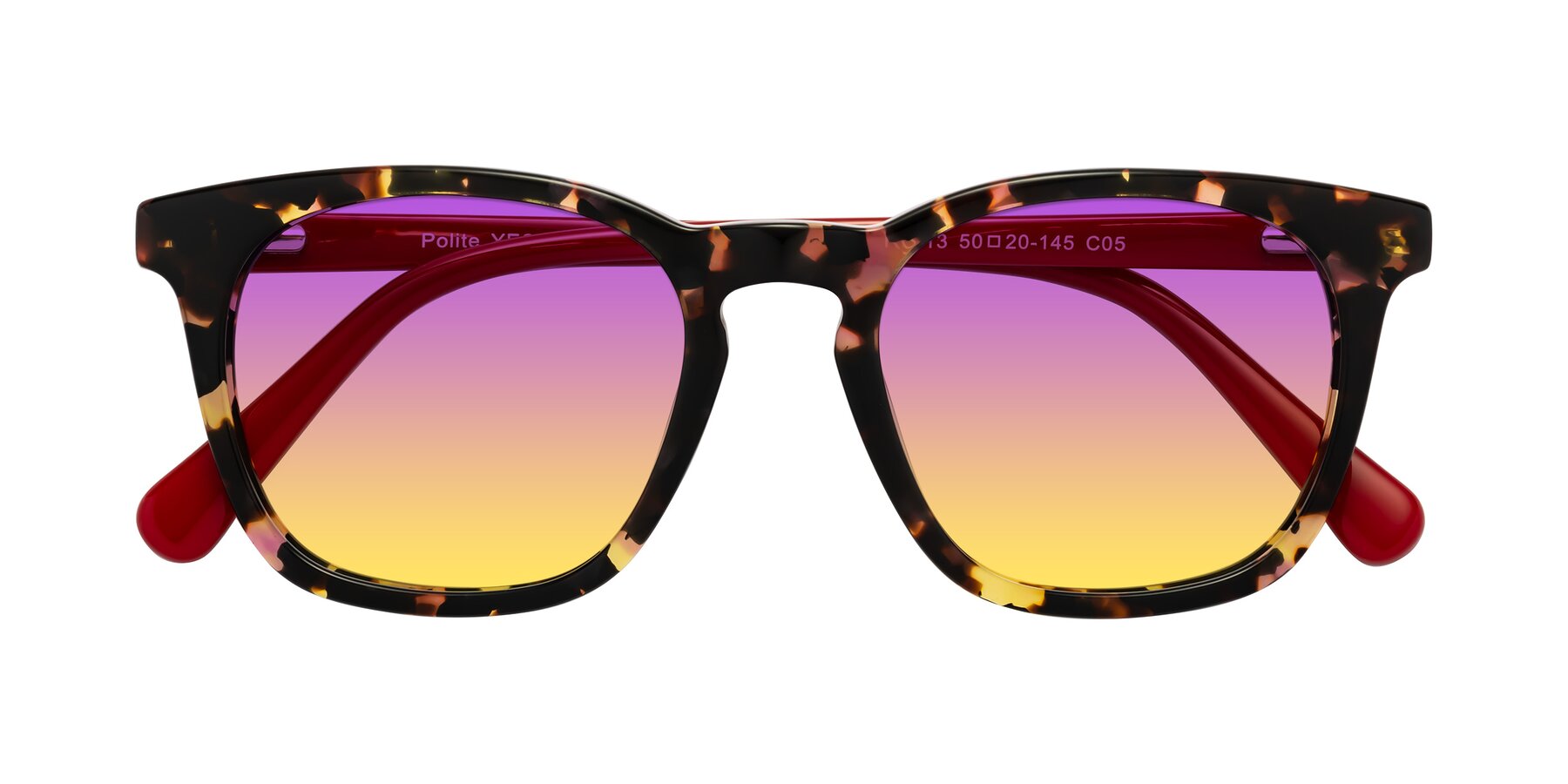 Tortoise/Red Keyhole Bridge Spring Hinges Trapezoid Gradient Sunglasses with Purple / Yellow Sunwear Lenses