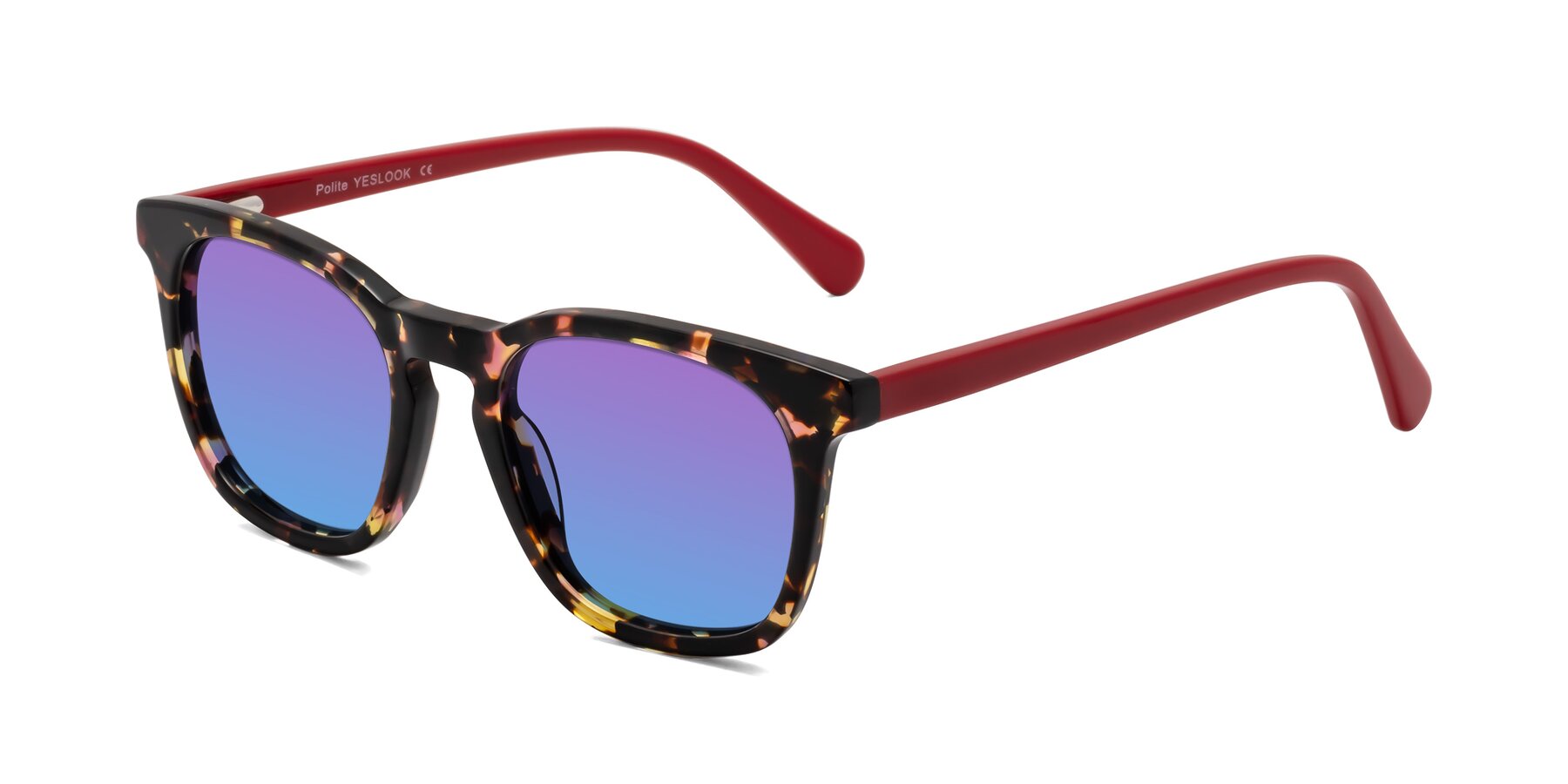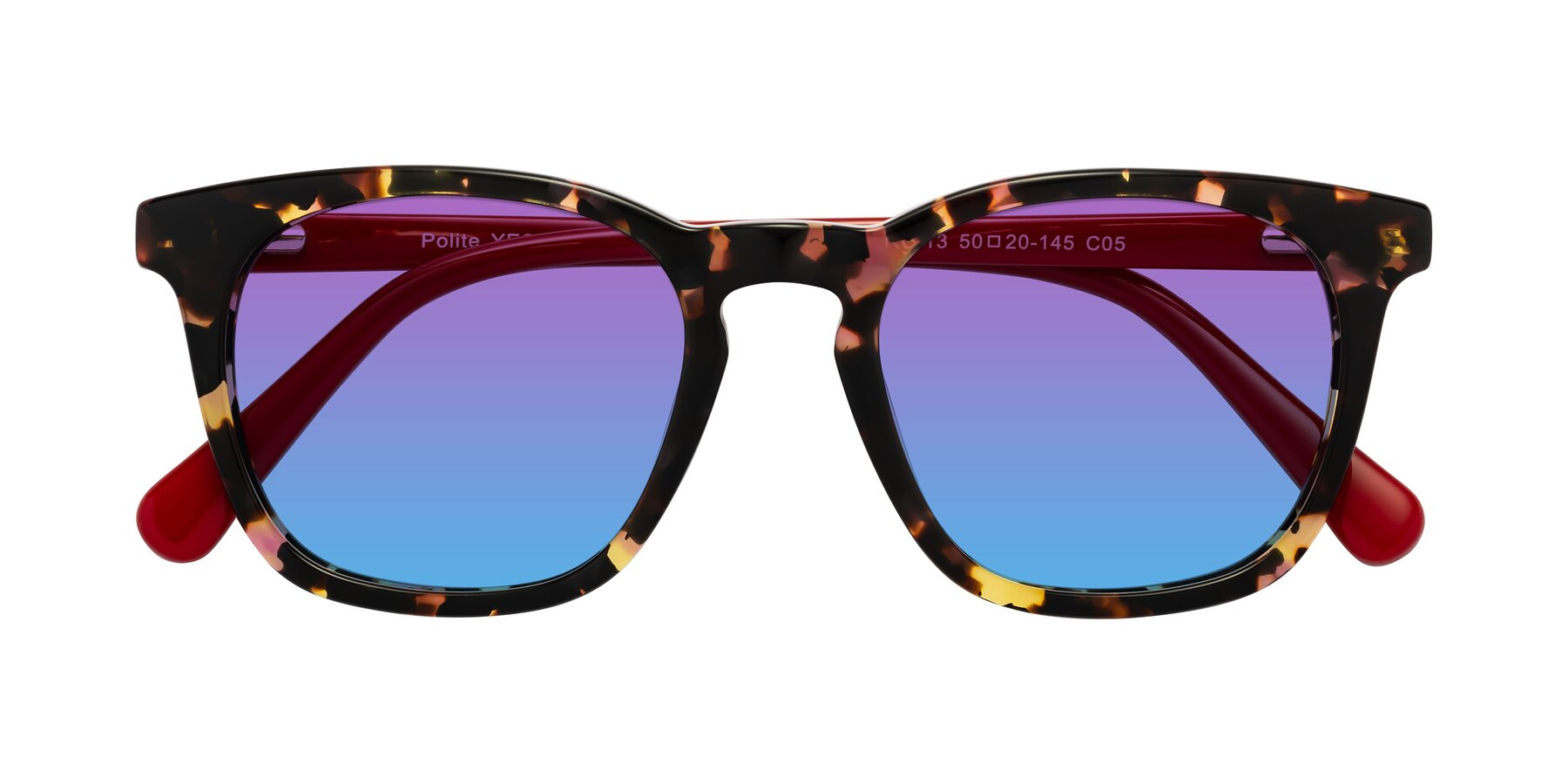 Tortoise/Red Keyhole Bridge Spring Hinges Trapezoid Gradient Sunglasses with Purple / Blue Sunwear Lenses