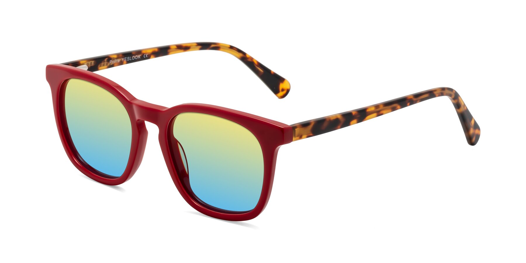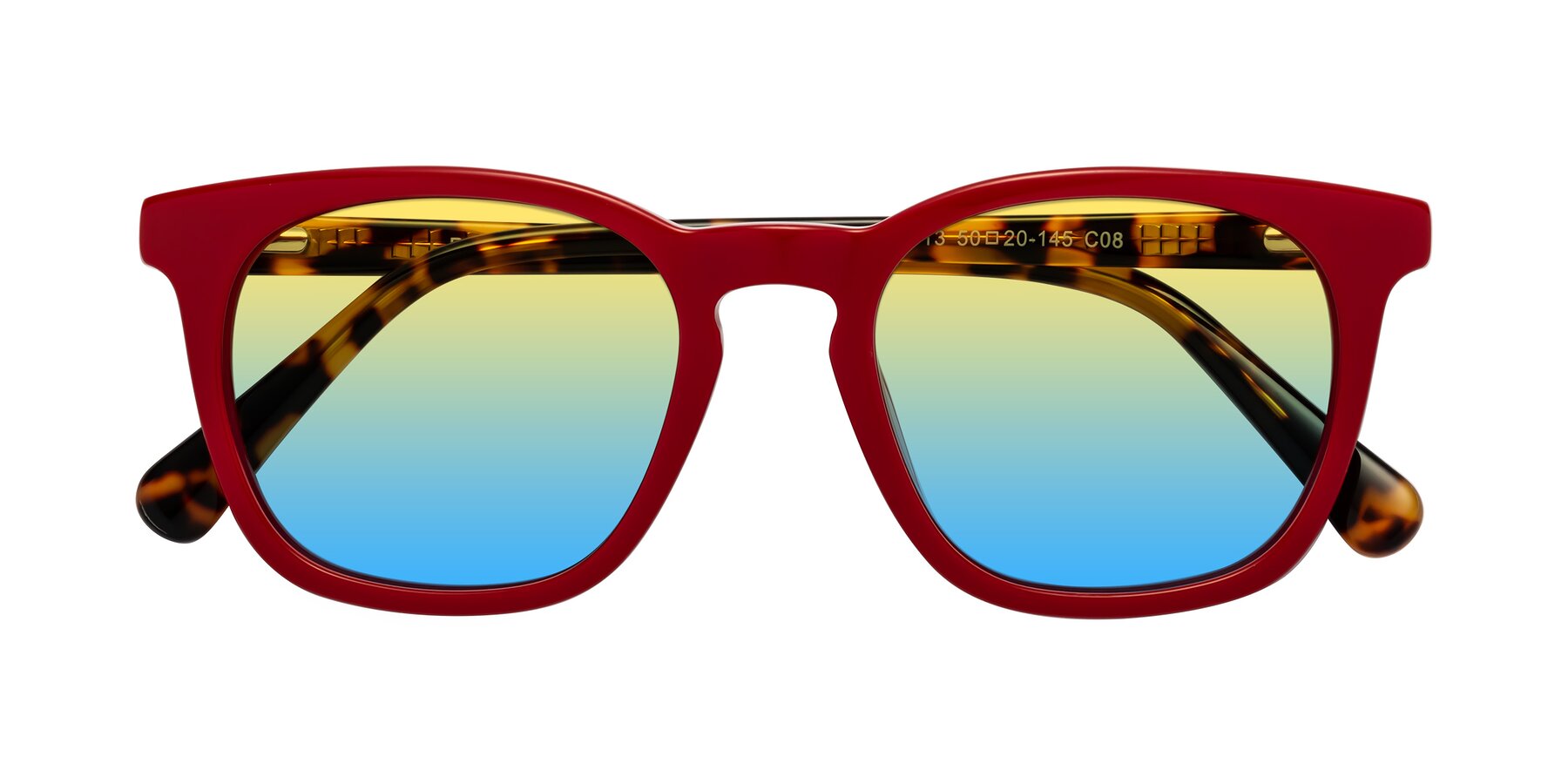 Red/Tortoise Keyhole Bridge Spring Hinges Trapezoid Gradient Sunglasses with Yellow / Blue Sunwear Lenses